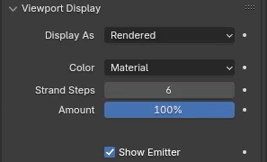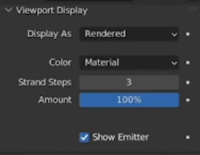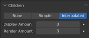 En Particles>Children: cambiar el modo a “Interpolated” y modificar los valores de “Display Amount” y “Render Amount” para aumentar el volumen del pelo.