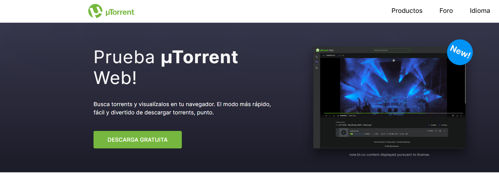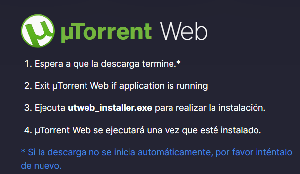 Para descargar un Torrent primero necesitamos descargar un cliente de Torrent, el oficial y el cual recomiendo usar es Utorrent web, para ello ve a la página oficial, selecciona descarga y sigue los pasos de instalación.