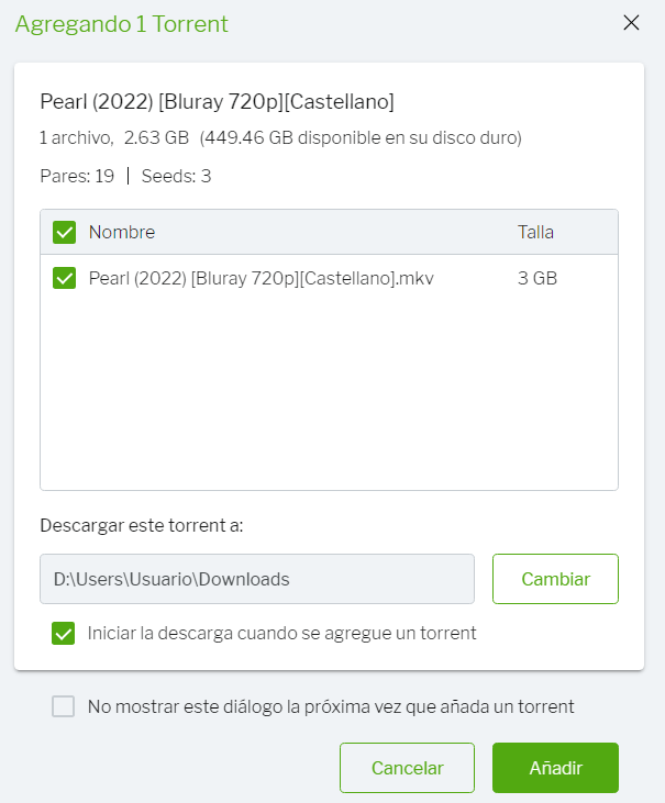 A veces el torrent esta asociado a varios archivos además de la pelicula, en ese caso los desmarcamos y nos quedamos unicamente con la pelicula, que suele ser el archivo mas pesado y con extensiones “.avi”, “.mp4”, “.mkv”, etc… Seleccionamos donde queremos que se instale y le damos a añadir.
