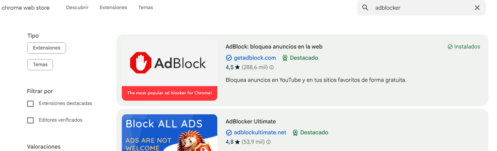 Conviene utilizar un navegador que bloquee anuncios y ventanas emergentes automáticamente pero también puedes instalar una extensión en Chrome que lo haga, para ello pon Chrome web store en el navegador y busca adblocker.