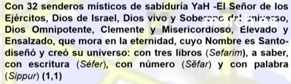 habla de 32 senderos místicos de sabiduría en los que dios a los que se hace referencia con multitud de nombres, diseño y creo el universo, es decir el texto habla de una creación alterativa a la propuesta en el génesis