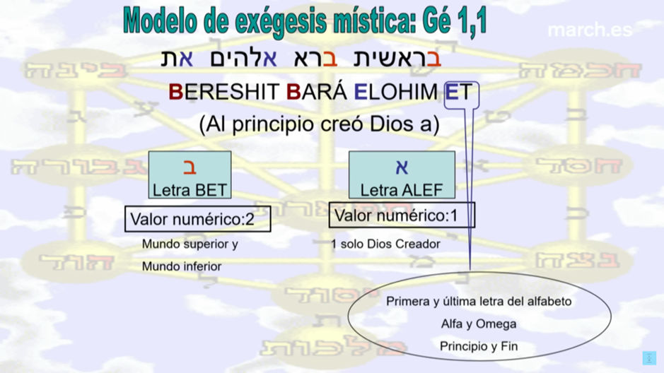 A su vez la ultima palabra “ET” (preposición) esta formada por la primera y la ultima letra del alfabeto hebreo indicando que abarca todo el alfabeto y por ello dios el el principio y el fin, el alfa y el omega, el todo y el uno.