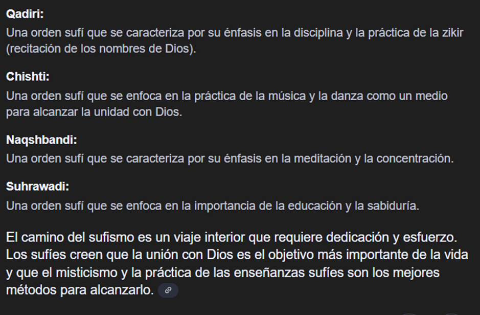 El sufismo en general es una corriente mística islámica, casi siempre práctica, en la que los devotos buscan encontrar las verdades divinas y el conocimiento a través de una experiencia personal y directa con dios, lo cual se puede interpretar como una especie de gnosis o de iluminación, consiste en una variedad de caminos místicos diseñados para determinar la naturaleza de distintas cuestiones.