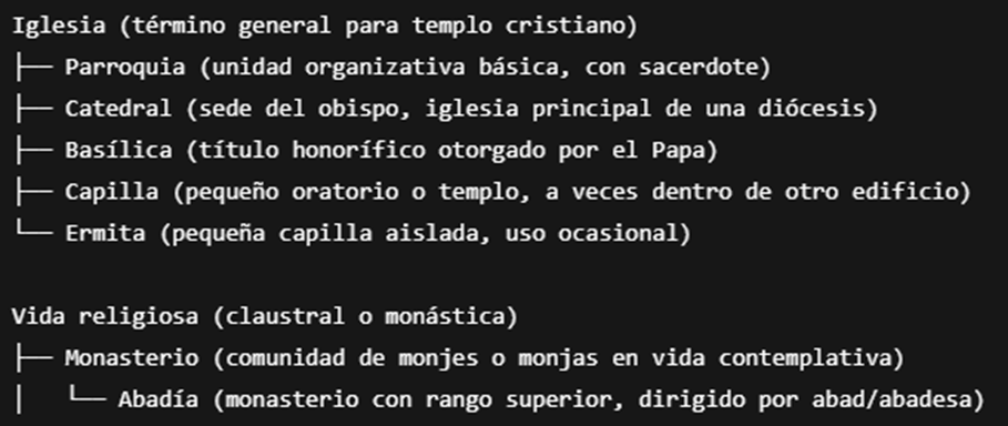 - Uso: Término amplio que abarca desde pequeñas capillas hasta grandes catedrales.