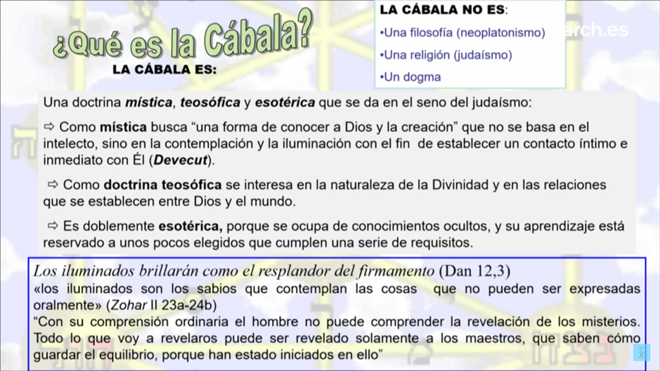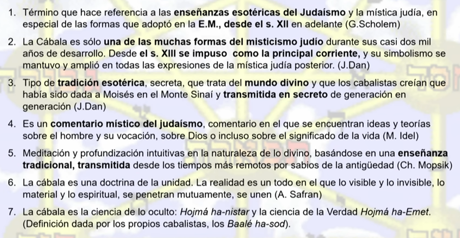Define la cábala como las enseñanzas esotéricas del judaísmo y la mística judía, es decir una enseñanza oculta, un conocimiento no conocido por todo el público, especialmente las adoptadas en la edad media desde el siglo XII en adelante, especialmente desarrollada en las comunidades judías del sur occidental de Europa, concretamente Provenza, Languedoc y la península ibérica.