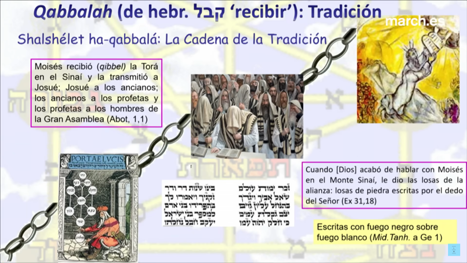 Transmisión que empezó con dios transmitiéndole el saber, La Tora a Moisés en el monte Sinaí, este se la transmitió a Josué, el a los ancianos, los ancianos a los profetas, ellos a los hombres de la gran asamblea continuando hasta nuestros días.