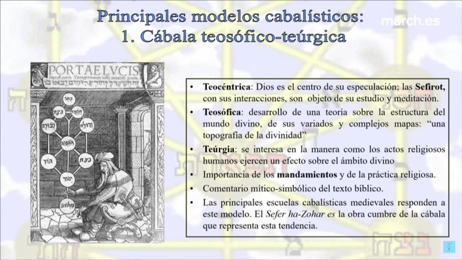 El más conocido es el llamado como la cábala teosófica teúrgica, que se interesa especulación acerca de la estructura del mundo divino, la sefirot, los ángeles que lo componen, en el aprendizaje de una vía ritual y experimental que permita al hombre la relación con la divinidad para provocar en el un estado de armonía que también influirá en el mundo divino, conocido por el nombre de teúrgia.