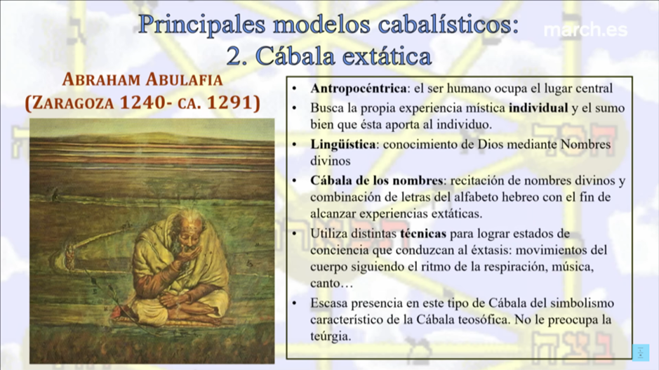 Se trata en definitiva en alcanzar un estado de conciencia alterada que lleve al místico al éxtasis, hecho habitualmente mediante la repetición de nombres divinos, nombres enérgicos, o también con técnicas no propiamente judías, como movimientos del cuerpo siguiendo el ritmo de la respiración, la música, el canto, sin preocuparse demasiado del simbolismo característico la sefirot, la cábala teosófica.