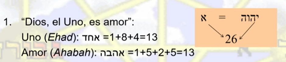 Pudiendo afirmar que dios es 1 y es amor ya que la suma de los valores las letras de uno (Ehad) suman 13 y amor se escribe (Ahabah) y sus letras también suman 13.