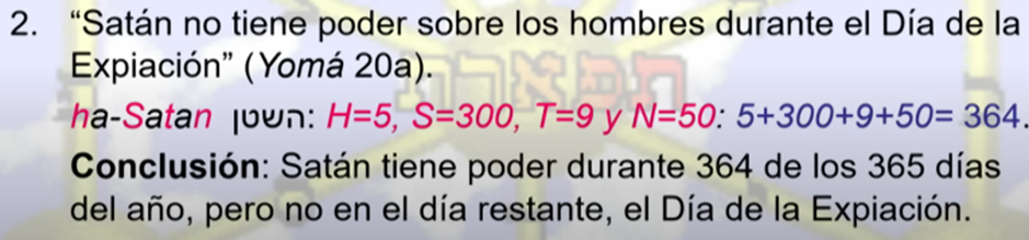 Otro ejemplo rabínico no cabalístico de la interpretación de un tratado talmúdico dice que satán no tiene influencia sobre los hombres el dia de la expiación, como los valores de satan suman 364, por lo que concluyen que satán tiene influencia 364 días de los 365.