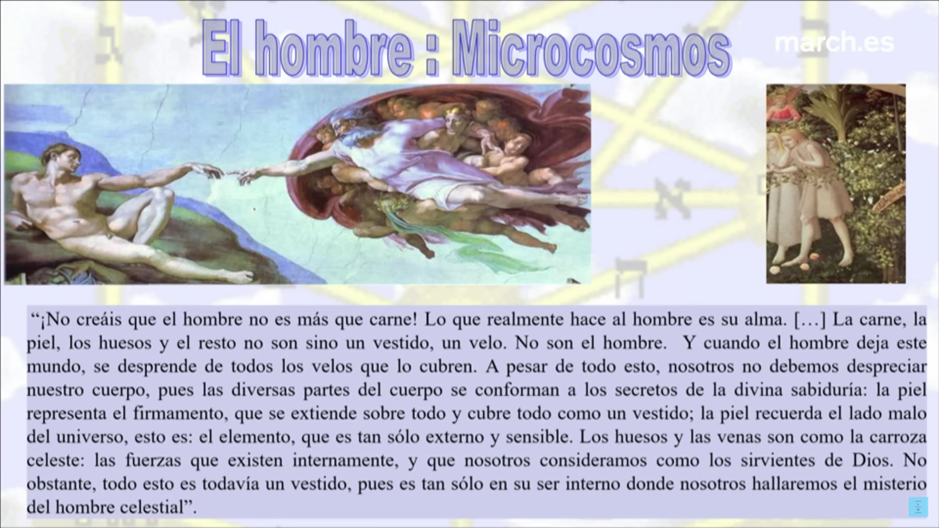 Este hombre comprende todo lo que hay arriba y abajo, es decir es un microcosmos y por eso dios lo ha escogido como su propia forma, en vez de ser el hombre a imagen de dios, se le da la vuelta y dios elige la imagen del hombre cuando se quiere manifestar, hacer visible, pero este hombre no es el actual, si no la del hombre primordial, el que existía antes de la caída provocada por el pecado, un hombre que tenía unas dimensiones cósmicas que según la mística media quinientos años de marcha de una extremo al otro igual que el universo y quinientos años de altura desde la cabeza a los pies igual que lo que media el universo, es decir un arquetipo divino.